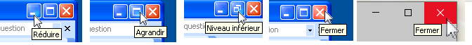 - Réduire : réduit totalement la fenêtre, sans la fermer, elle est visible sous forme d’icône dans la base des tâches. On dit parfois "iconiser" (impropre).