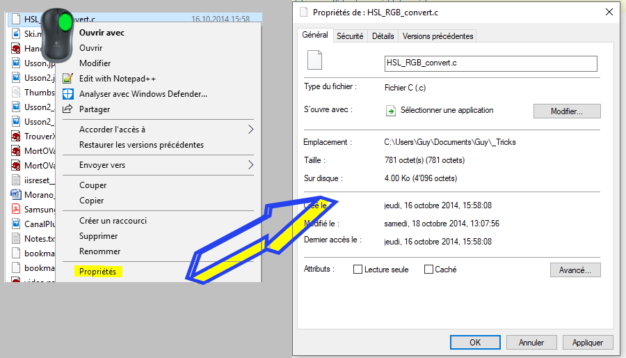 Les propriétés courantes peuvent être affichées dans les fenêtres suivantes obtenues par un clic droit sur le fichier dans l'explorateur :