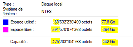 En réalité les valeurs sont exprimés en kio (kibioctets) ou en Gio (gibioctets) et non ko ou en Go.
