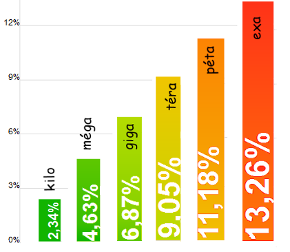 En informatique les valeurs sont exprimées en multiples de 2, ainsi 1000 vaut 210 = 1024, donc les chiffres exprimés sont souvent un peu faux vis à vis de l'unité mais c'est accepté par facilité du langage, d'autant mieux que le pourcentage d'erreur est faible pour les petites quantités.
